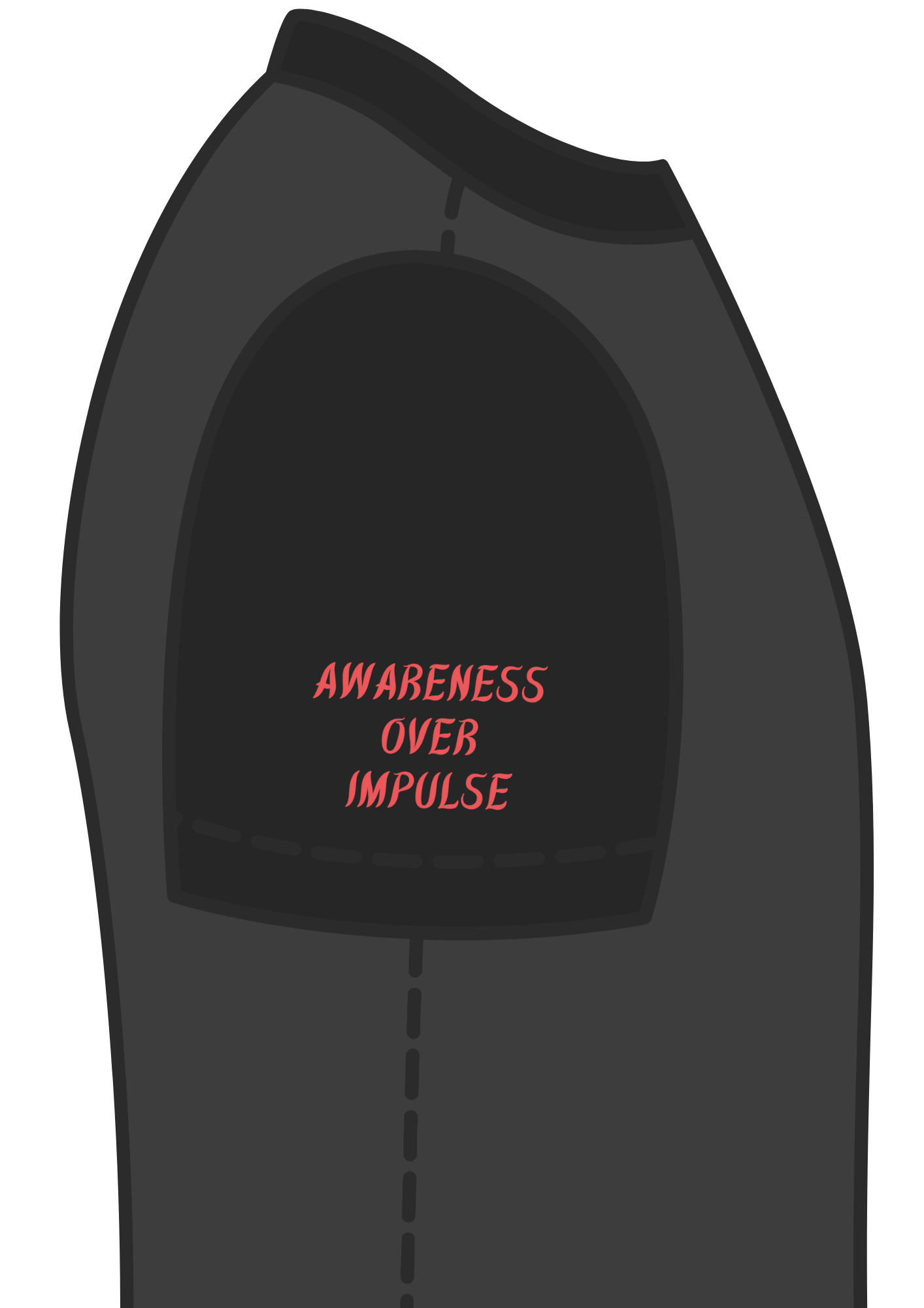On the sleeve, Awareness over impulse tempers that heat with consciousness. The pairing turns anger into a tool — not a tantrum.
