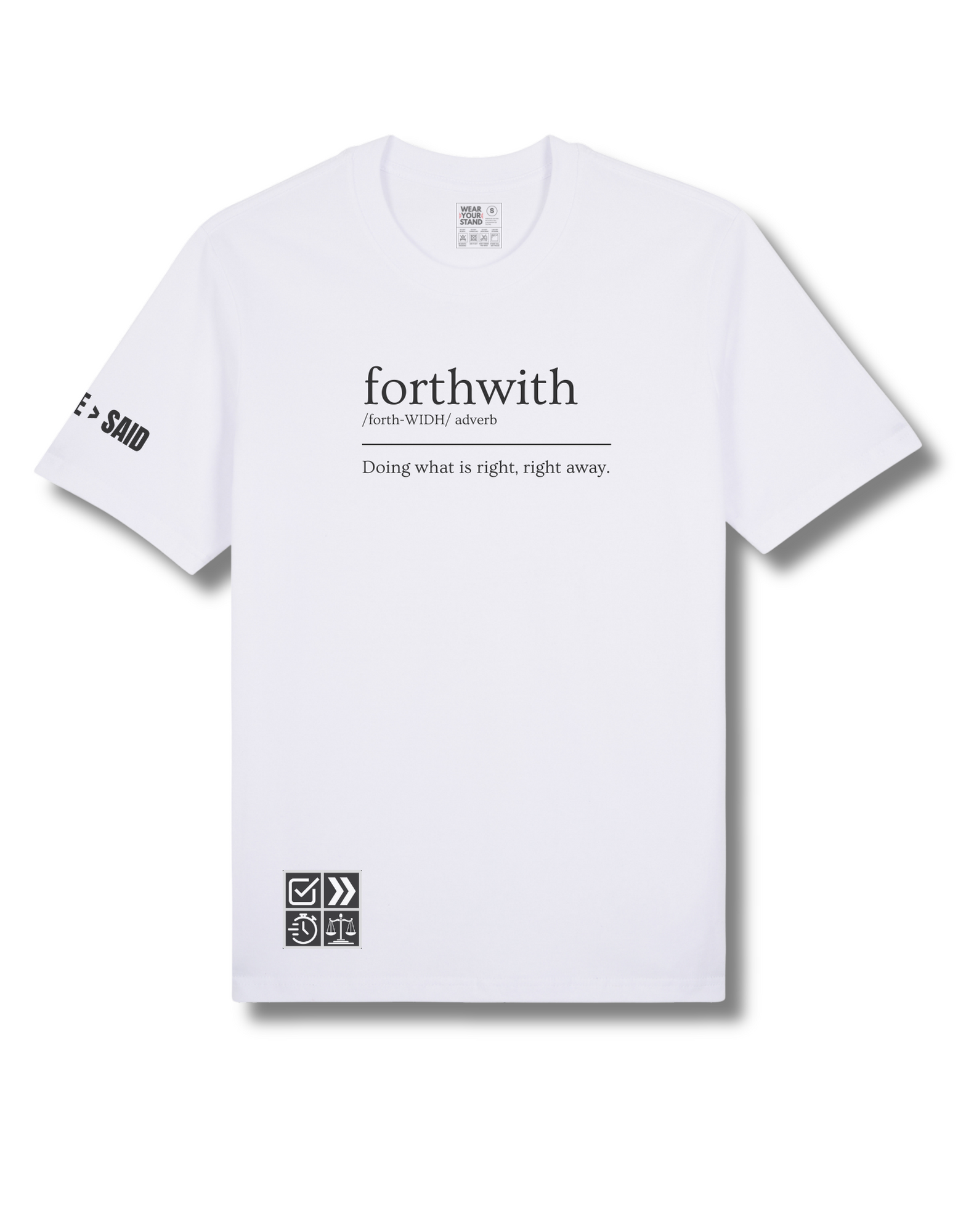 At the center chest, it defines the word forthwith like a dictionary entry—Doing what is right, right away. It’s sharp, clean, and instantly makes your shirt a conversation starter.