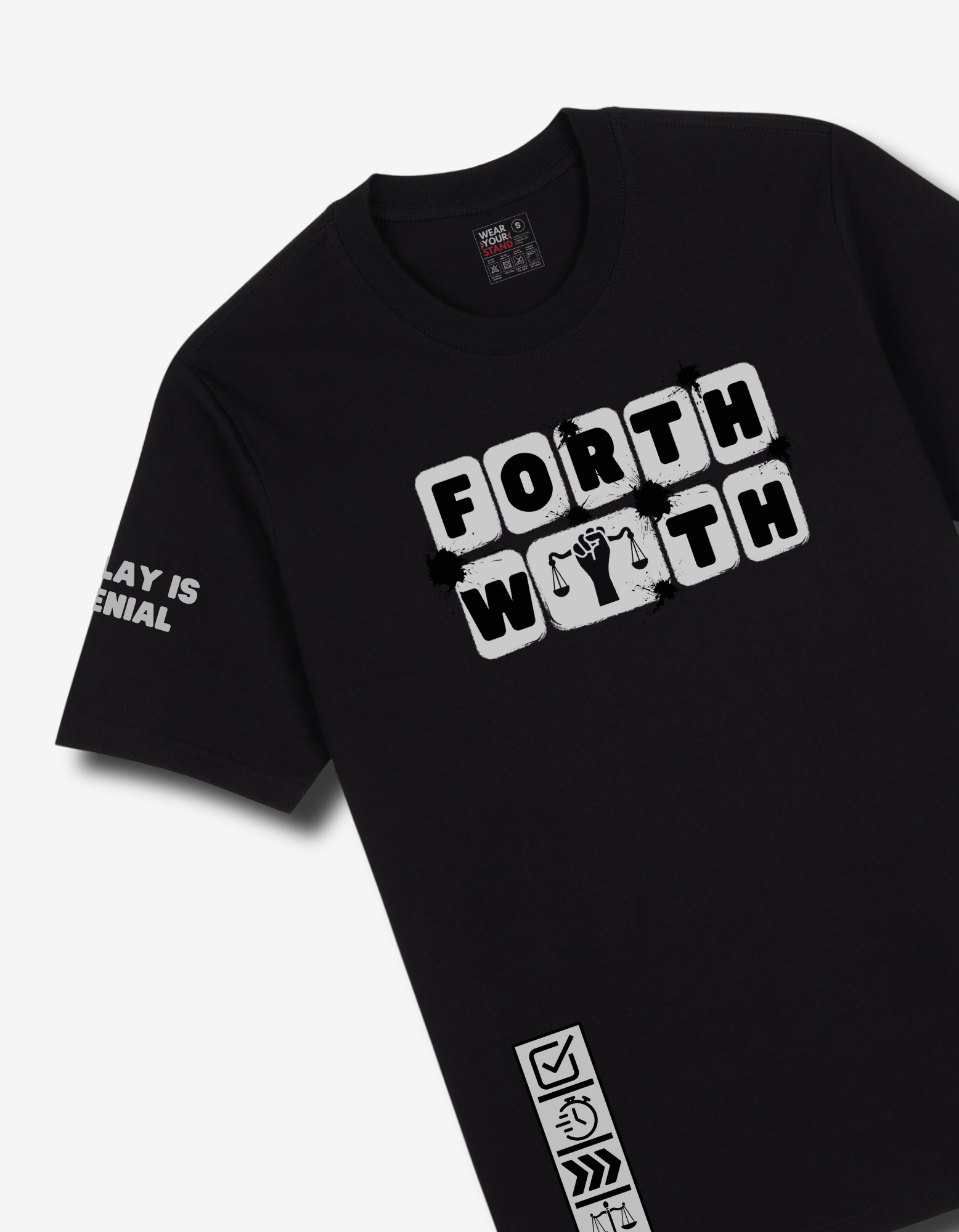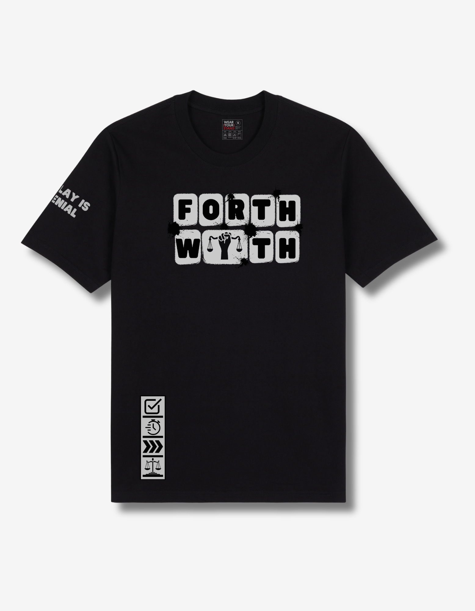 This wearable grit from that Forthwith Collection features a front design that turns the word Forthwith into gritty, distressed keyboard blocks, complete with a justice-scale “Y” — symbolizing that justice must be pressed forthwith. It feels raw, urban, and alive.